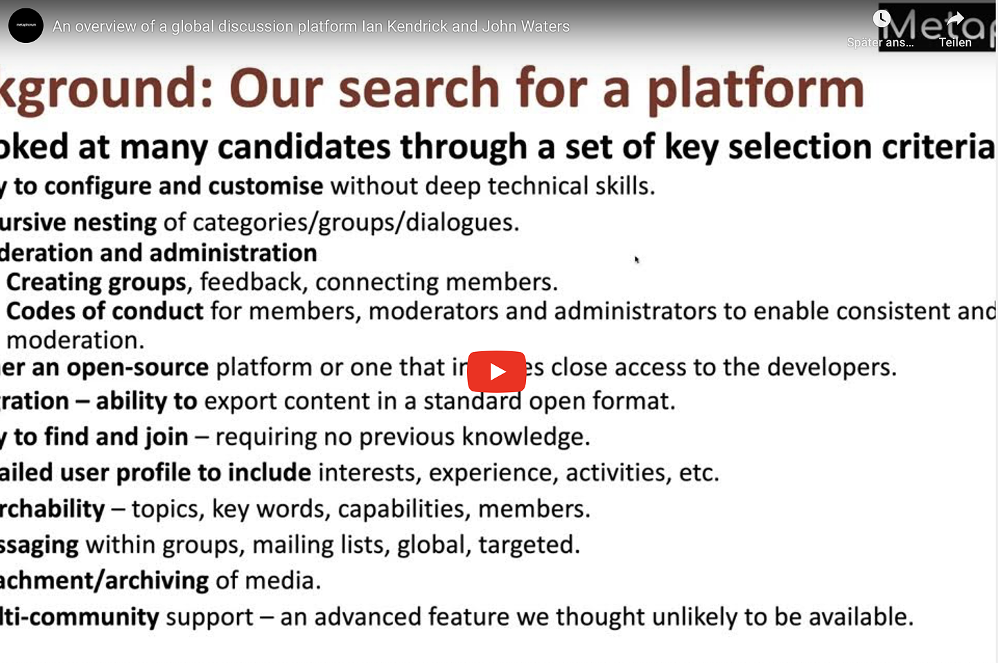 This webinar will explore several aspects of the large-scale communications platform outlined briefly at the 2023 Metaphorum Conference, including the vision that led to its creation, the problems already identified over a number of years that motivated its creation, and numerous factors that had to be considered before any work could begin.