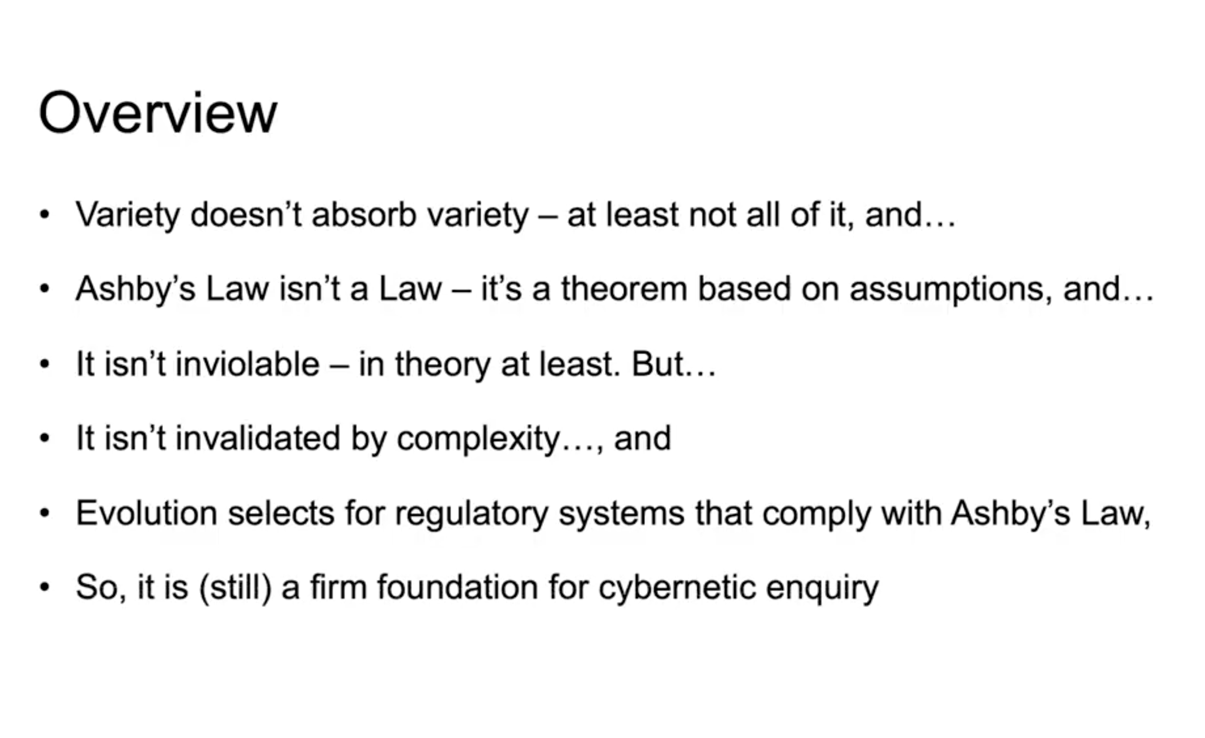 Like most people in this community I suspect, I first encounter Ross Ashby’s ‘Law of Requisite variety’ through Stafford Beer, who regarded it as the foundational concept upon which his cybernetic work was built. As a result, one of the first books I read when I started my PhD was Ashby’s ‘Introduction to Cybernetics’. Subsequently, whenever I have given presentations on my own work, I have always avoided explaining its significance since I assumed that my audience was as familiar with this as me: and I didn’t want to patronise them or embarrass myself. Over the years I have, however, come to the view that I was wrong. If they were aware at all most people have got beyond the aphorism ‘only variety absorbs variety’ which, as it turns out, is misleading at best. In this talk I will explore the significance, limitations and implications of Ashby’s Law through the lens of my personal journey. Along the way I will explain the importance of qua specification, debate whether it is a ‘law’ at all, and explore the relationship between cybernetics and complexity science.